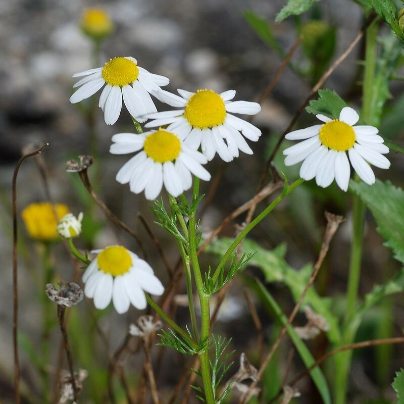 洋甘菊是一種常見的草本植物,也被稱為德國洋甘菊或羅馬洋甘菊。它是菊科植物中的一員,通常被用作藥用和花卉用途。洋甘菊原產於歐洲和西亞地區,現在已經在世界各地廣泛種植。洋甘菊有白色和黃色的花朵,花瓣呈尖齒狀,花心中央有黃色小花組成。它們通常被用來製作茶、精油和其他藥物,具有鎮靜、消炎、抗菌、抗氧化等多種功效。
