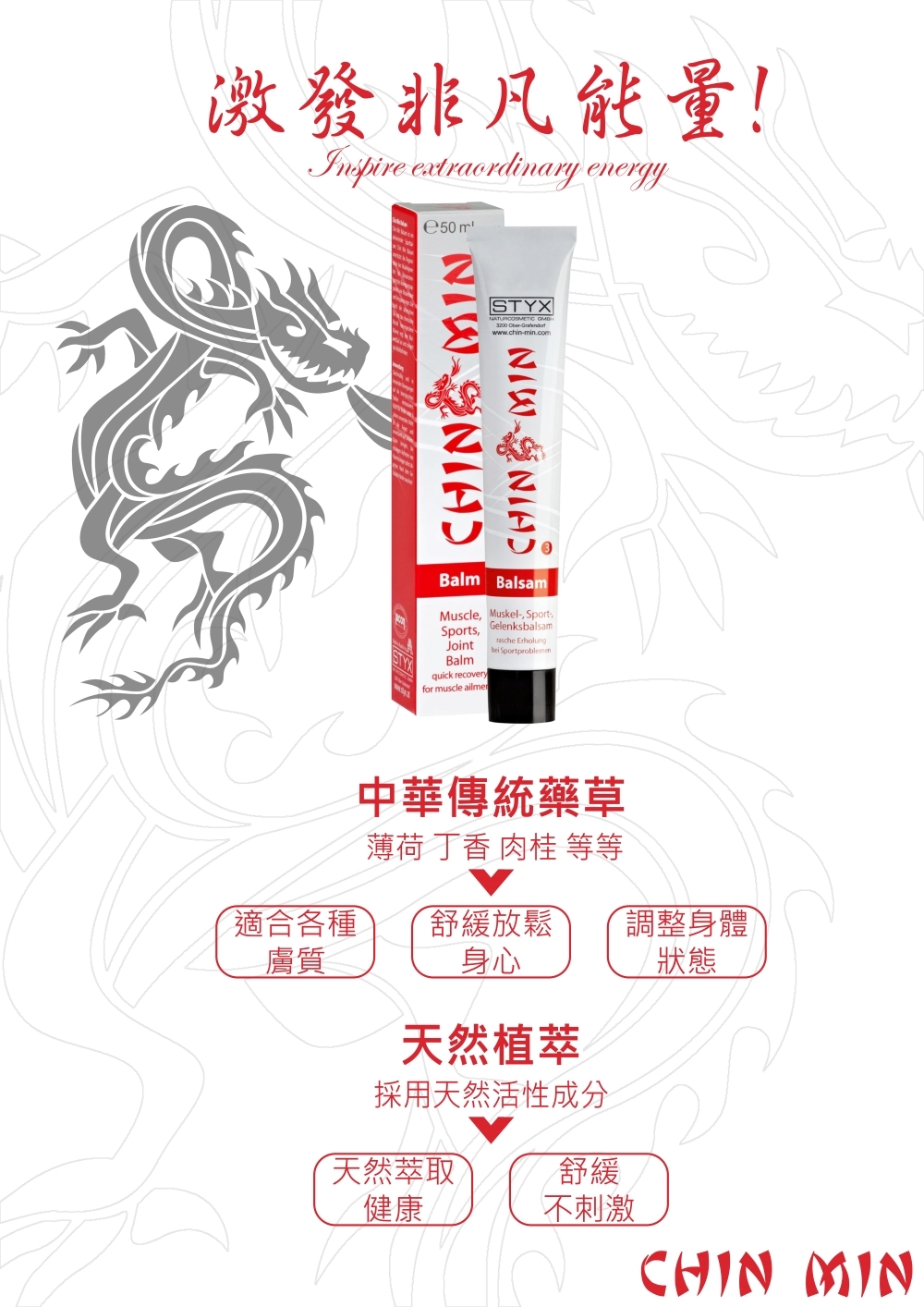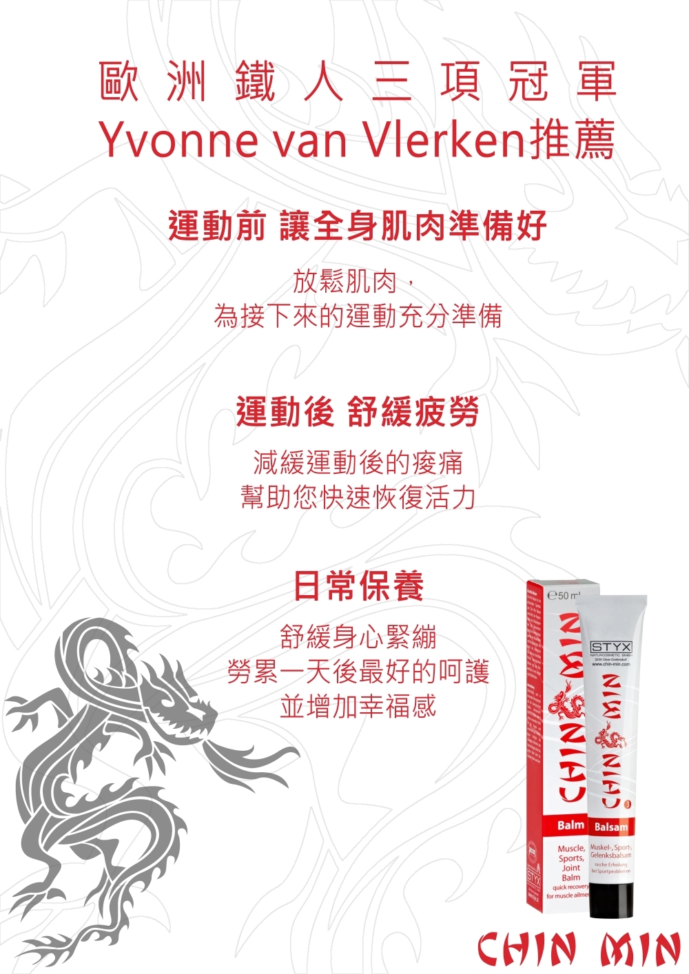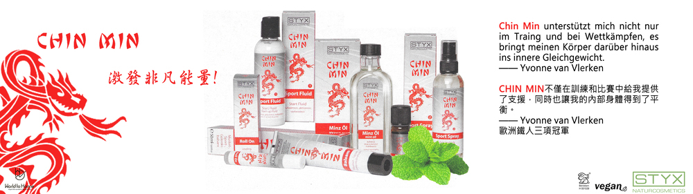 通過精油和薄荷油,讓得到最有效的放鬆。歐洲鐵人三項冠軍Yvonne Van Vlerken推薦。Chin Min 運用傳統中醫知識,並將其與競技和耐力運動的最新科學發現相結合。一個協調的範圍為身體和肌肉提供能量和營養。肌肉得到最佳調整以適應性能,減少受傷的風險。過度勞累和運動損傷會導致快速再生。