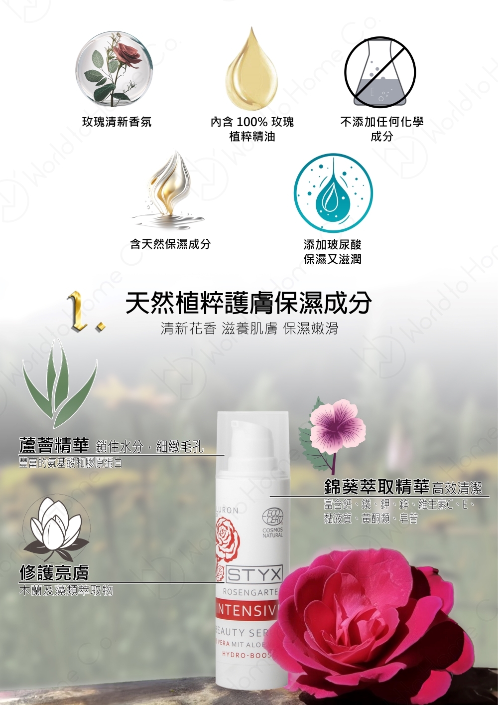 玫瑰油,玻尿酸,蘆薈,錦葵,木蘭,藻類