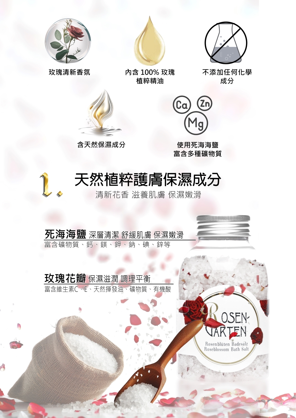 死海海鹽、玫瑰花瓣、玫瑰香氛